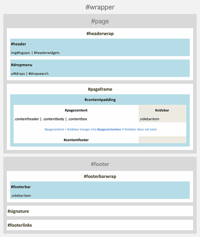 Wrapper div for #pagecontent, #sidebar, .contentfooter. The #pageframe div is special: it knows if #sidebar floats left, right, or is trailing the body, and will position any background image accordingly [left | center | right]. |