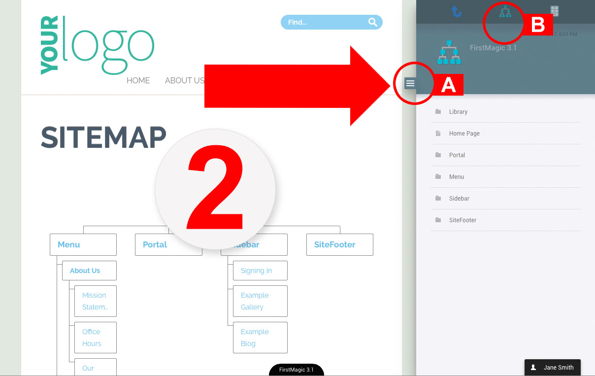 The hamburger Icon in the right margin of all pages you have ownership to [A] opens the File Manager, where you create, edit, delete, move, or unpublish content.